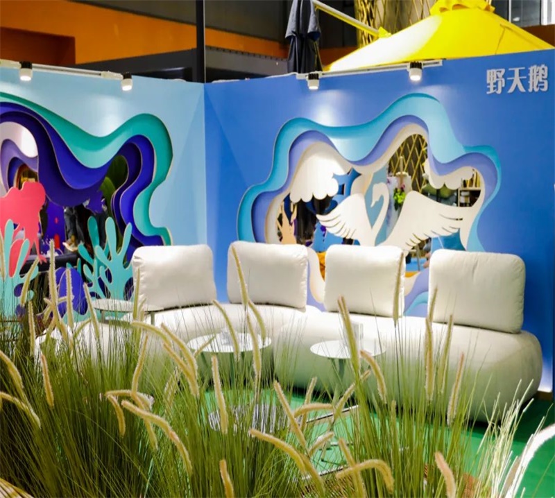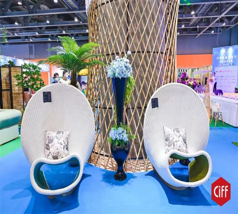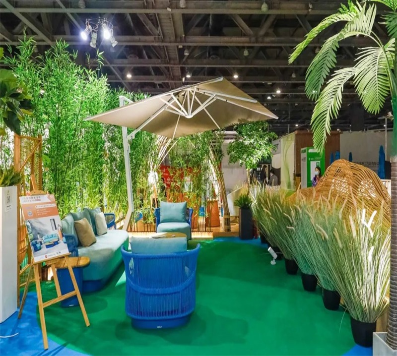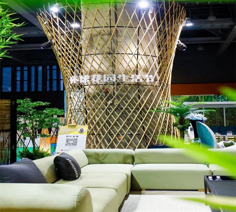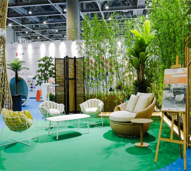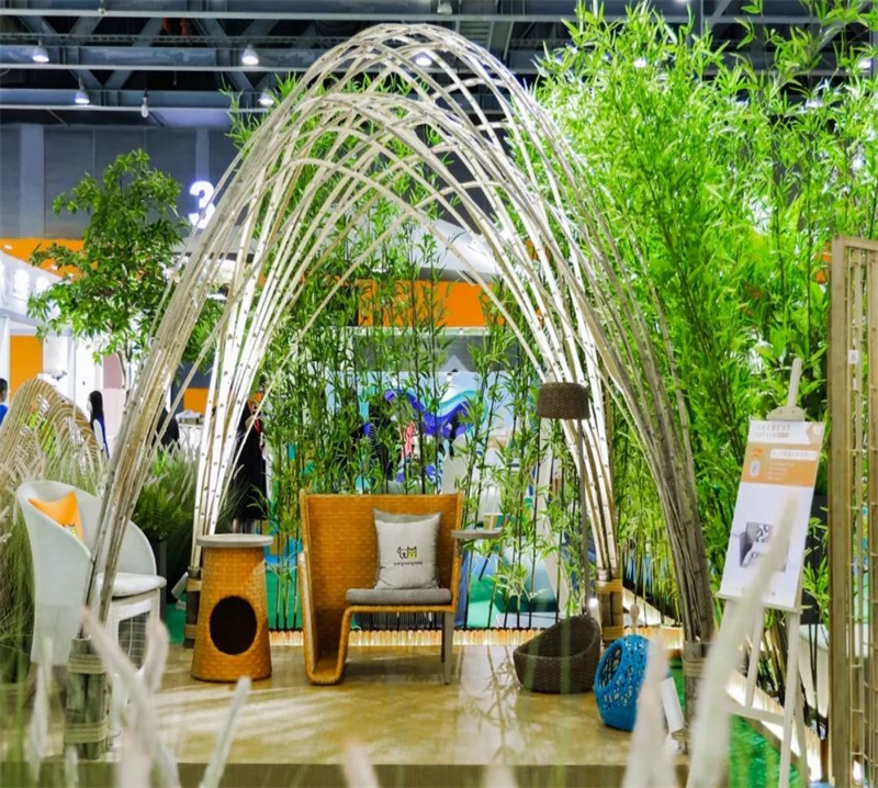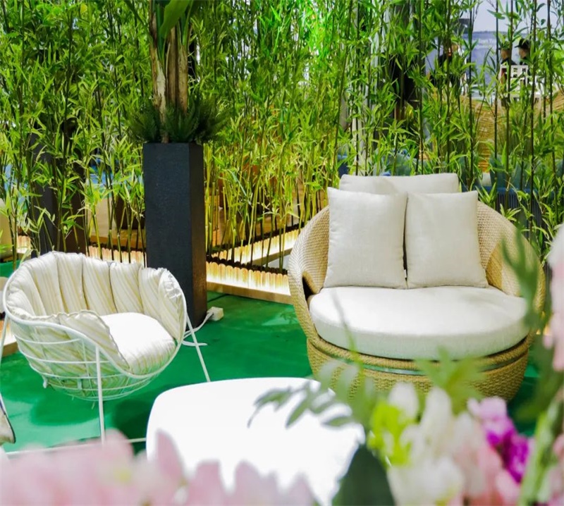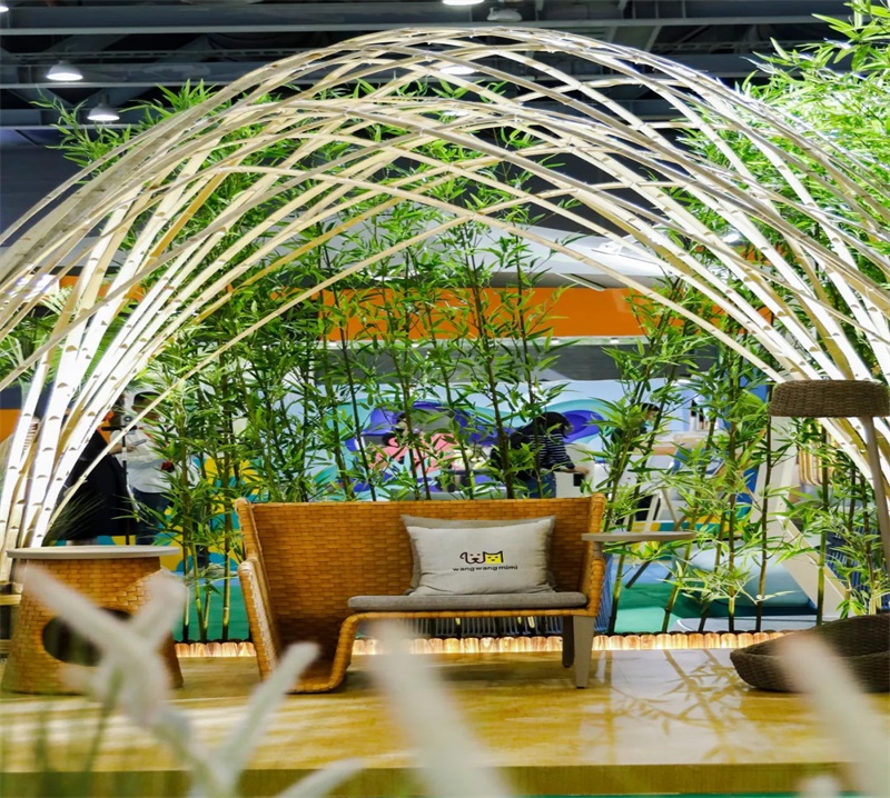 荣泰开发的仿竹片藤被用作装修材料,装点展会入口,让观众全面了解户外家具行业最前沿产品以及最新的趋势变化的同时,感受到户外材料的可塑性和运用面的广泛性。