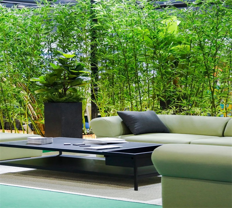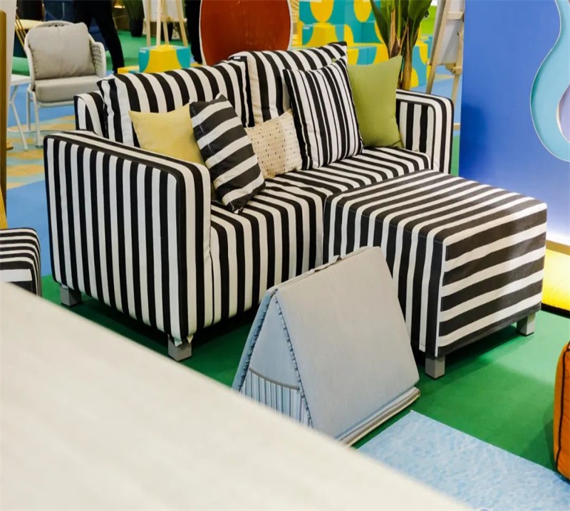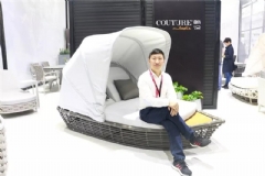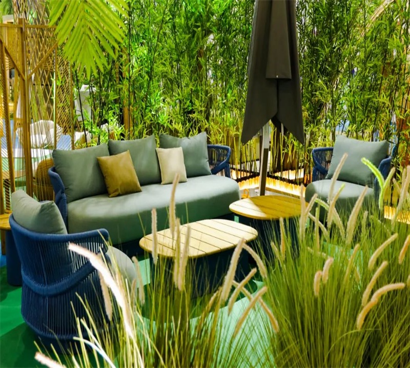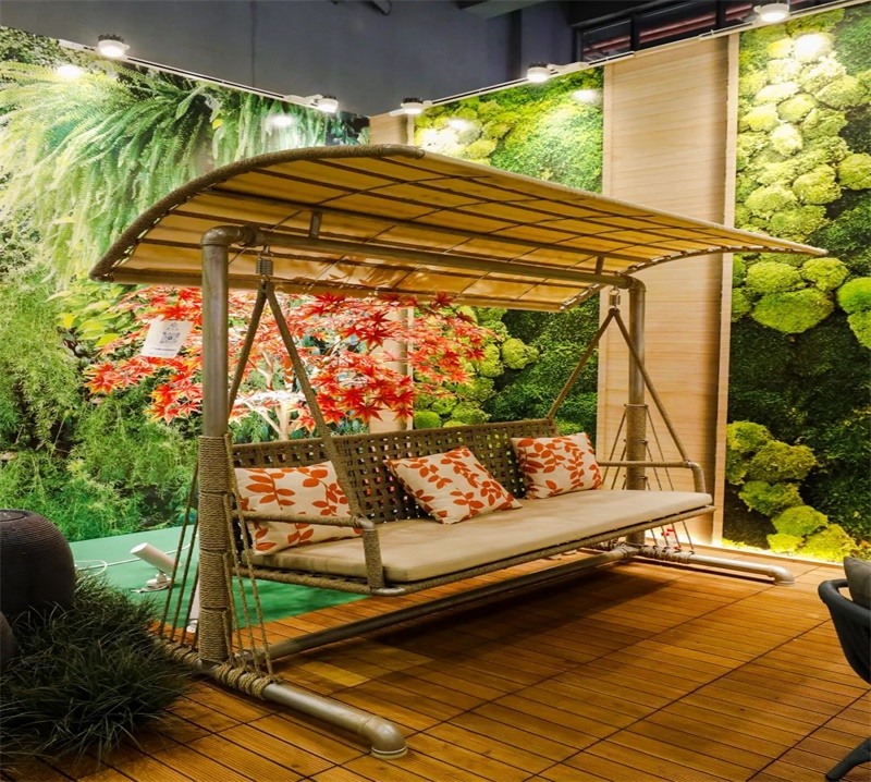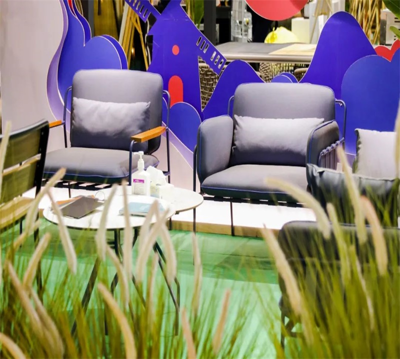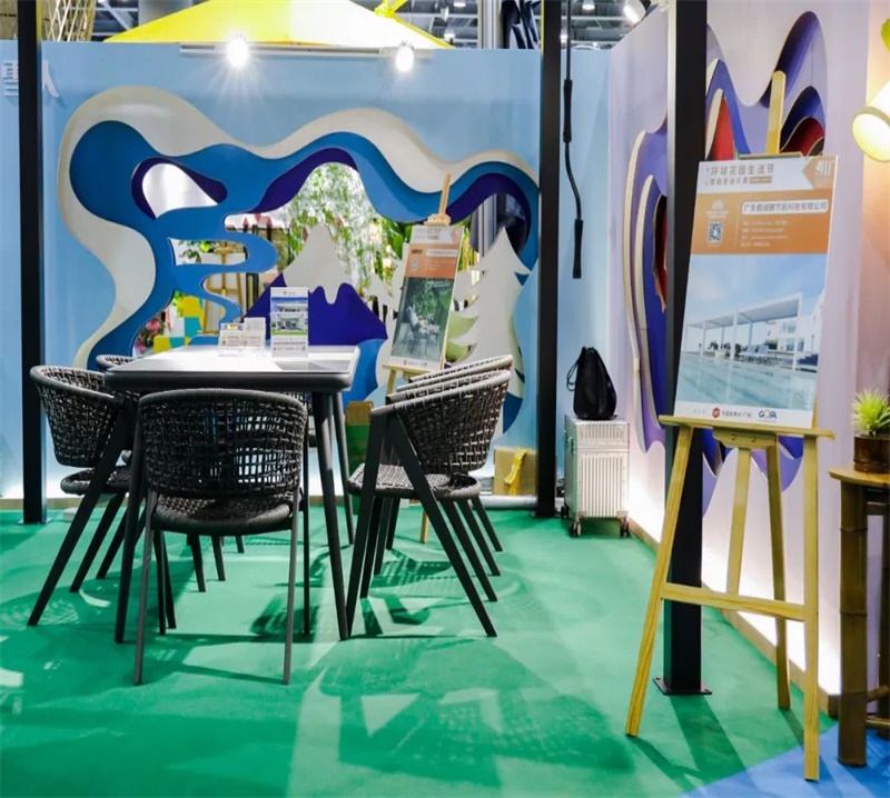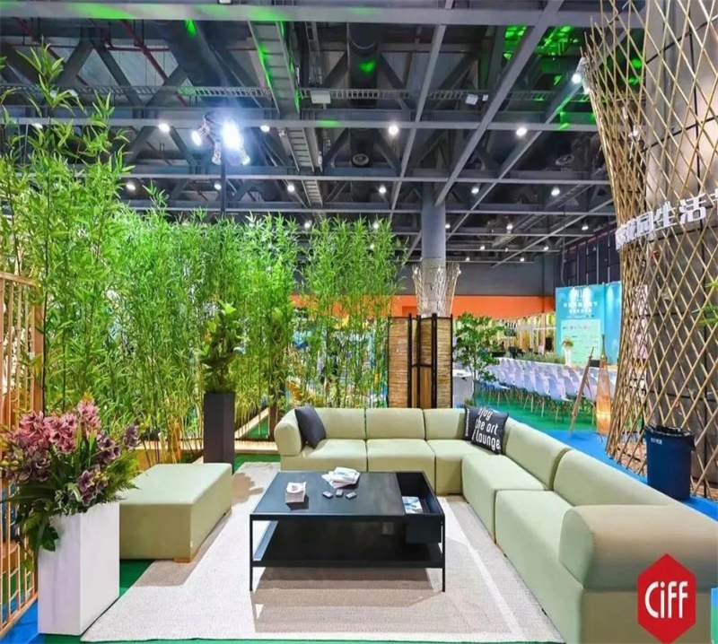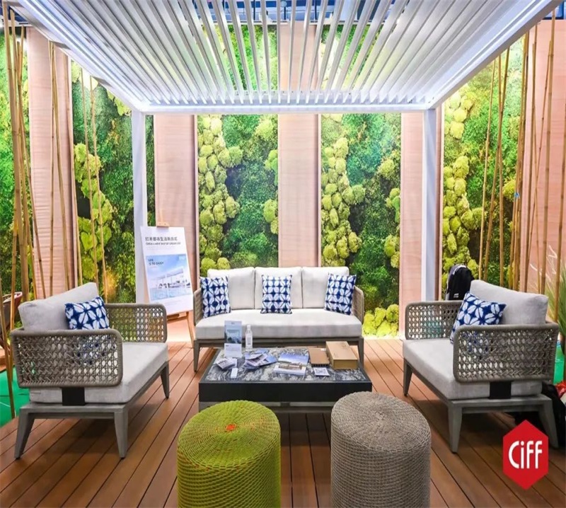 荣泰开发的仿竹片藤被用作装修材料,装点展会入口,让观众全面了解户外家具行业最前沿产品以及最新的趋势变化的同时,感受到户外材料的可塑性和运用面的广泛性。